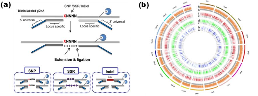 针对上述技术难题,课题组开发了可取代昂贵固相芯片平台的液相分子杂交技术HD-Marker(即“液相芯片”技术),通过在单个 PCR 管内的高集成度探针杂交-延伸-连接反应,实现对多达上万个已知基因变异位点进行高通量筛查和分析。该技术不仅可高效检测SNP、Indel等标记,而且解决了长期以来SSR标记依赖凝胶电泳分型,难以高通量分析的局限,实现了多种标记类型的高通量分析。