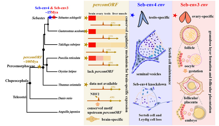在寻找“鱼类合胞素”的过程中,研究团队意外发现了另外两类具有独特功能的env基因,揭示了病毒基因功能的多维创新:一个在鲈形总目鱼类中高度保守的古老基因——percomORF特异性地高表达于脑,其表达受宿主神经分化因子NDF2的严格调控。该基因的捕获远在平鲉属胎生起源之前,意味着其可能早已被鲈形总目祖先“征用”,参与神经网络的构建或通讯。另一类许氏平鲉特有的Seb-env4基因则被整合进了雄性生殖系统的发育调控机制中。