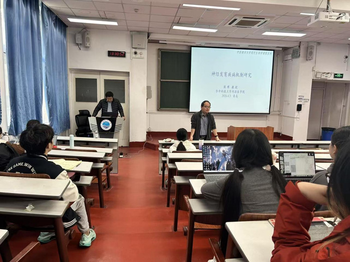 熊博教授在课上系统阐述了神经发育疾病(NDD)的遗传机制,并以DDX3X和PPP2R1A为例揭示其分子通路。其中NDD是一类发育早期起病、导致社交、学习等功能障碍的疾病,遗传贡献率高达64-91%。研究显示,DDX3X缺失可通过下调Notch信号导致神经干细胞减少、兴奋/抑制(E/I)失衡及社交与认知缺陷。而PPP2R1A在前脑兴奋性神经元中的单倍剂量不足引起小鼠空间学习记忆障碍,并揭示了PP2A活性下降通过降低EZH2蛋白稳定性,进而上调内源性大麻素降解酶MAGL,使2-AG降解增加、大麻素信号减弱,最终造成突触前释放概率升高及E/I失衡。该研究为理解NDD的病因及靶向MAGL的干预策略提供了重要依据。