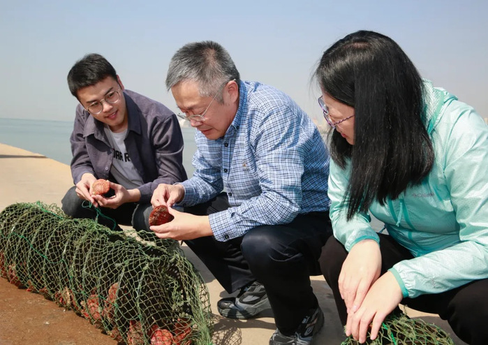 包振民院士(中)查看扇贝生长情况